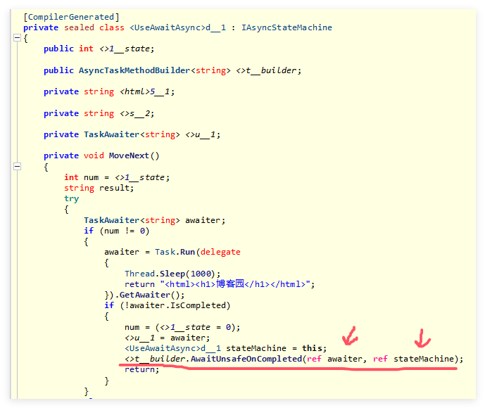 那這段代碼在底層是如何運(yùn)作的呢?剛才也說(shuō)到了asyncawait只是迷惑你的一種幻象,我們必須手握辟邪寶劍斬開幻象顯真身,這里借助 ilspy 截圖如下: