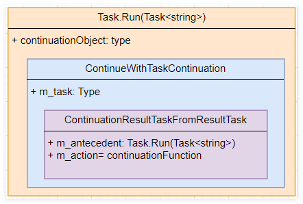 從卦代碼看確實(shí)沒有asyncawait簡(jiǎn)潔,那 ContinueWith 內(nèi)部做了什么呢?感興趣的朋友可以跟蹤一下,本質(zhì)上和 StateMachine 的玩法是一樣的,都是借助 m_continuationObject 來(lái)實(shí)現(xiàn)延續(xù),畫個(gè)簡(jiǎn)圖如下: