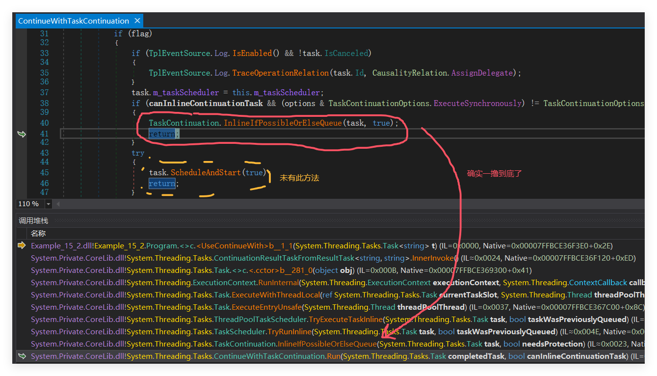 從卦中可以看到,延續(xù)任務(wù)使用新線程來(lái)執(zhí)行的,并沒有一擼到底,這明顯與 asyncawait 的方式不同,有些朋友可能又要說(shuō)了,那如何實(shí)現(xiàn)和StateMachine一樣的呢?這就需要在 ContinueWith 中新增 ExecuteSynchronously 同步參數(shù),參考如下: