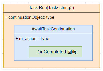 從卦中看,本質(zhì)上就是借助AsyncTaskMethodBuilder<string> 建造者將 awaiter 和 stateMachine 做了一個(gè)綁定,感興趣的朋友可以追一下 AwaitUnsafeOnCompleted() 方法,最后狀態(tài)機(jī) <UseAwaitAsync>d__1 實(shí)例會(huì)放入到 Task.Run 的 m_continuationObject 字段。如果有朋友對(duì)流程比較蒙的話,我畫了一張簡(jiǎn)圖。