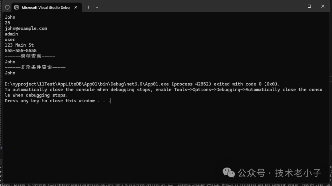 3.3 查詢文檔 // 根據(jù) Id 查詢單個(gè)用戶 public User GetUserById (int userId) { using (var db = CreateDatabaseConnection()) { var users = db.GetCollection<User>("users" ); return users.FindById(userId); } }// 復(fù)雜條件查詢 public List<User> QueryUsers(int minAge, string role) { using (var db = CreateDatabaseConnection()) { var users = db.GetCollection<User>("users" ); // 使用 LiteDB 支持的查詢方式 return users.Query() .Where(u => u.Age >= minAge && u.Roles != null && u.Roles.Contains(role) ) .OrderBy(u => u.Username) .Limit(100 ) .ToList(); } }// 模糊查詢 public List<User> SearchUsersByName(string keyword) { using (var db = CreateDatabaseConnection()) { var users = db.GetCollection<User>("users" ); return users.Query() .Where(u => u.Username.Contains(keyword)) .ToList(); } }調(diào)用 internal class Program { static void Main (string [] args) { UserRepository userRepository = new UserRepository(); var user = userRepository.GetUserById(1 ); //Console輸入出user的信息 Console.WriteLine(user.Username); Console.WriteLine(user.Age); Console.WriteLine(user.Email); foreach (var role in user.Roles) { Console.WriteLine(role); } Console.WriteLine(user.Profile.Address); Console.WriteLine(user.Profile.PhoneNumber); } }