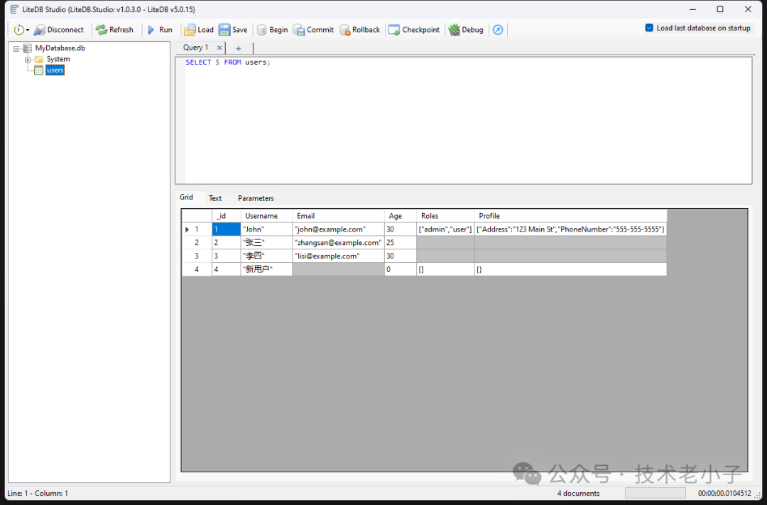 Install-Package LiteDB2. 定義實(shí)體模型 // 用戶實(shí)體類 public class User { // LiteDB 要求每個(gè)文檔都有一個(gè) Id 屬性 public int Id { get; set ; } // 用戶基本信息 public string Username { get; set ; } public string Email { get; set ; } public int Age { get; set ; } // 用戶角色信息 public string [] Roles { get; set ; } // 用戶詳細(xì)信息 public UserProfile Profile { get; set ; } }// 用戶詳細(xì)信息類 public class UserProfile { public string Address { get; set ; } public string PhoneNumber { get; set ; } }3. 數(shù)據(jù)庫(kù)連接與基本操作 3.1 創(chuàng)建數(shù)據(jù)庫(kù)連接 using LiteDB;public class UserRepository { // 數(shù)據(jù)庫(kù)連接字符串 private const string DATABASE_PATH = @"MyDatabase.db" ; // 創(chuàng)建數(shù)據(jù)庫(kù)連接 private LiteDatabase CreateDatabaseConnection () { // 創(chuàng)建 LiteDB 數(shù)據(jù)庫(kù)實(shí)例 return new LiteDatabase(DATABASE_PATH); } }3.2 插入文檔 public void InsertUser (User user) { // 使用 using 確保資源正確釋放 using (var db = CreateDatabaseConnection()) { // 獲取 Users 集合 var users = db.GetCollection<User>("users" ); // 插入單個(gè)文檔 users.Insert(user); // 插入多個(gè)文檔 var multiUsers = new List<User> { new User { Username = "張三" , Email = "zhangsan@example.com" , Age = 25 }, new User { Username = "李四" , Email = "lisi@example.com" , Age = 30 } }; users.InsertBulk(multiUsers); } }調(diào)用 internal class Program { static void Main (string [] args) { UserRepository userRepository = new UserRepository(); userRepository.InsertUser(new User { Id = 1 , Username = "John" , Age = 25 , Email = "john@example.com" , Roles = new string [] { "admin" , "user" }, Profile = new UserProfile { Address = "123 Main St" , PhoneNumber = "555-555-5555" } }); } }