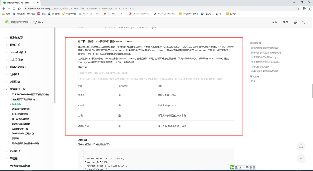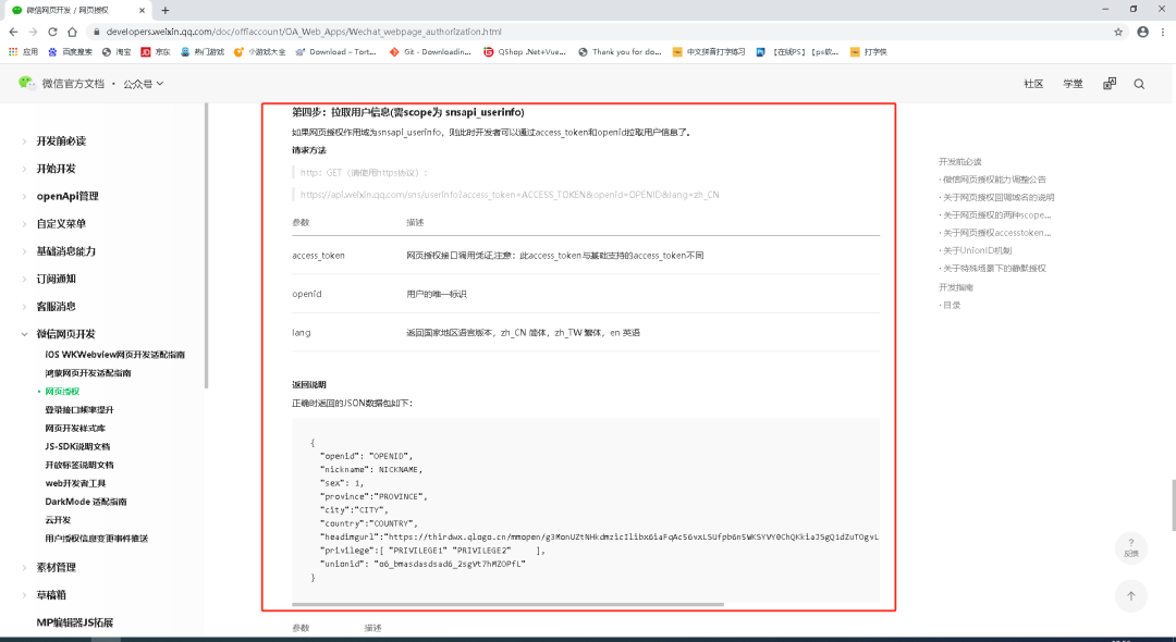 /// <summary> ///用code換取獲取用戶信息(包括非關(guān)注用戶的)(此access_token是網(wǎng)頁授權(quán)的和普通無關(guān)) /// </summary> /// <param name="Appid"></param> /// <param name="Appsecret"></param> /// <param name="Code">回調(diào)頁面帶的code參數(shù)</param> /// <returns>獲取用戶信息(json格式)</returns> public static Dictionary<string, object> GetUserInfoByCode(string Appid, string Appsecret, string Code){ //通過code換取網(wǎng)頁授權(quán)access_token JavaScriptSerializer Jss = new JavaScriptSerializer(); string url = string.Format("https://api.weixin.qq.com/sns/oauth2/access_token?appid={0}&secret={1}&code={2}&grant_type=authorization_code", Appid, Appsecret, Code); string ReText = Tools.WebRequestPostOrGet(url, "");//post/get方法獲取信息 Dictionary<string, object> DicText = (Dictionary<string, object>)Jss.DeserializeObject(ReText); if (!DicText.ContainsKey("openid")) { return DicText; } else { //拉取用戶信息(需scope為 snsapi_userinfo) Dictionary<string, object> respDic = (Dictionary<string, object>)Jss.DeserializeObject(Tools.WebRequestPostOrGet("https://api.weixin.qq.com/sns/userinfo?access_token=" + DicText["access_token"] + "&openid=" + DicText["openid"] + "&lang=zh_CN", "")); return respDic; }}