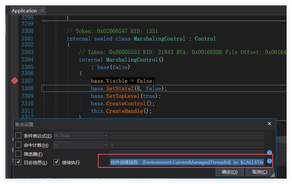 如何使用 dnspy 對(duì) MarshalingControl..ctor 進(jìn)行干預(yù)呢?可以使用 斷點(diǎn)日志 的功能,日志信息如下: