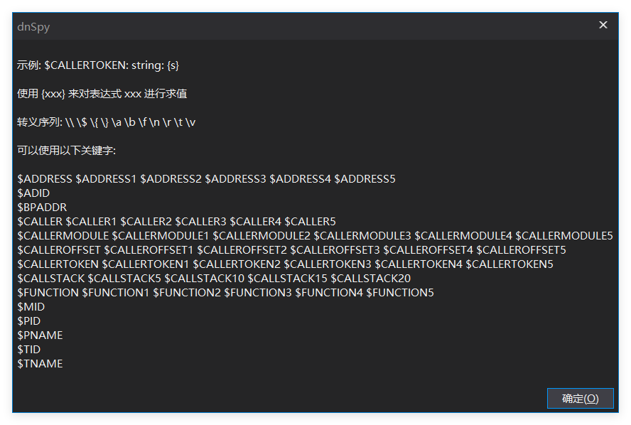 有些人可能要問了 $CALLSTACK 是什么東西?很顯然是堆棧信息,除了這個(gè)關(guān)鍵詞還有很多,具體可以看后面的 問號(hào)面板。