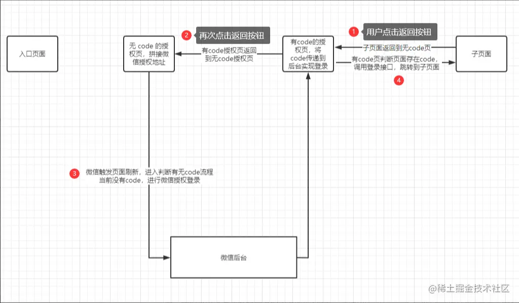 從子頁面返回到入口頁形成的循環(huán)授權(quán)登錄完成了入口頁面到子頁面的跳轉(zhuǎn),現(xiàn)在點擊返回按鈕或者通過手勢操作滑動屏幕回到入口頁面,頁面流轉(zhuǎn)過程如下圖所示:(這里有個前置知識:返回到上級頁面微信內(nèi)置瀏覽器會觸發(fā)上級頁面重新加載。)