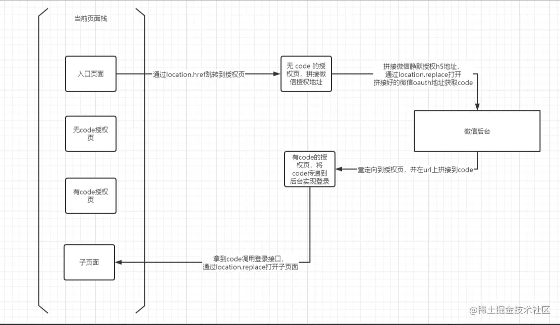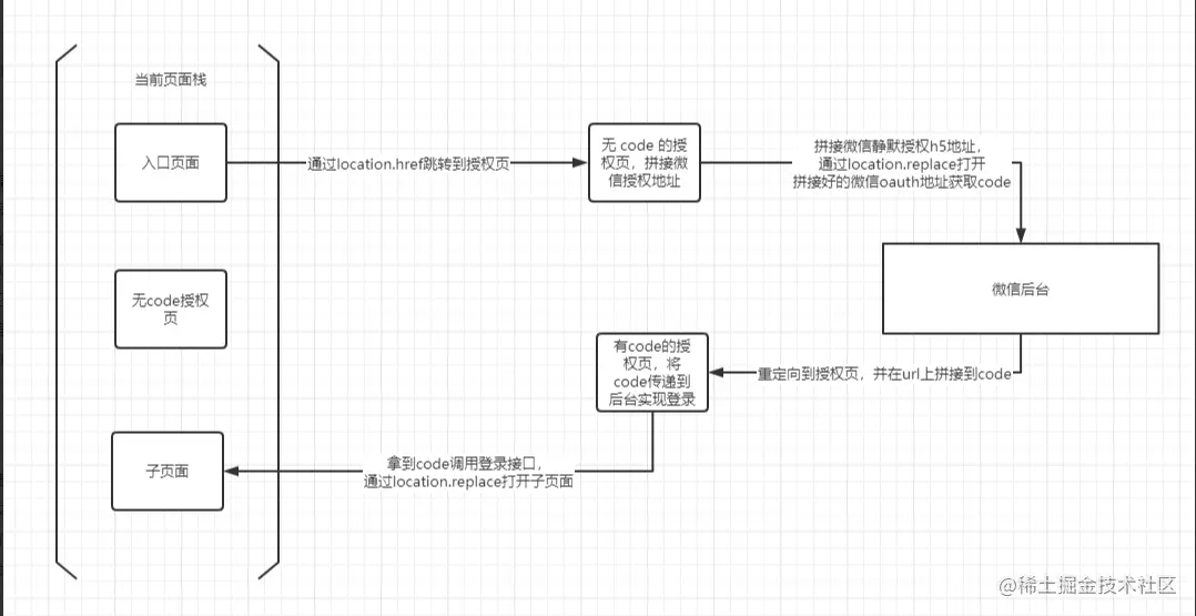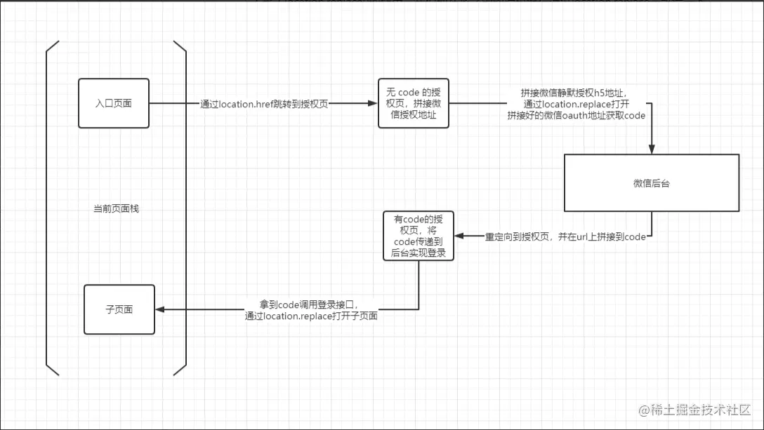 解決方案了解了整個問題形成的原因,以及使用location.replace之后頁面棧中的狀況,再來解決返回循環(huán)授權(quán)這一問題就很簡單了。 在有code的頁面調(diào)用登錄接口成功之后,我們向sessionStorage中存一個臨時值再跳轉(zhuǎn)到子頁面,然后修改空白授權(quán)頁的初始化邏輯即可: 注:空白授權(quán)頁為應(yīng)用的入口,頁面返回即關(guān)閉應(yīng)用。我們可以判斷臨時值是否存在,存在則執(zhí)行 wx.closeWindow() 關(guān)閉整個網(wǎng)頁窗口即可完成應(yīng)用退出。 ?作者:小草先森tyro 鏈接:https://juejin.cn/post/6969876122871791623 來源:稀土掘金 著作權(quán)歸作者所有。商業(yè)轉(zhuǎn)載請聯(lián)系作者獲得授權(quán),非商業(yè)轉(zhuǎn)載請注明出處。 該文章在 2025/1/15 13:09:43 編輯過 |