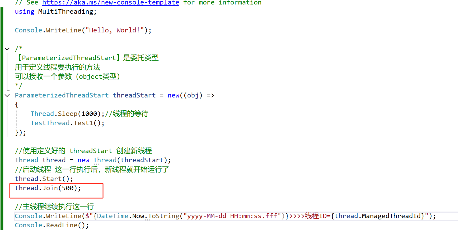 如下圖所示,在thread線程內部執(zhí)行完成以后,很快就接著執(zhí)行最后的打印輸出方法了 9、Thread.Join(毫秒) 代表等待當前線程執(zhí)行多長時間,如果超出設定的毫秒數,就會直接執(zhí)行后續(xù)的代碼