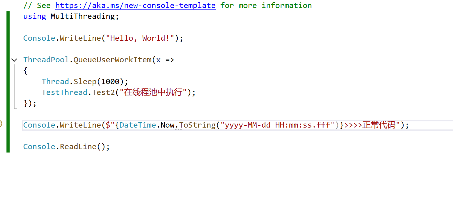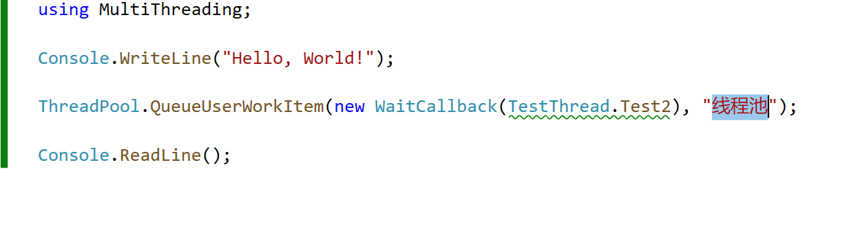 2、WaitCallback也是一個委托,傳入需要在線程池內執(zhí)行的方法名稱。以下代碼內,“線程池”字符串為要執(zhí)行方法對應的參數