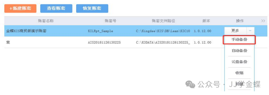 5、金蝶專業(yè)版14.1及以后版本的賬套備份: 服務(wù)器電腦右下角任務(wù)欄雙擊打開【金蝶KIS專業(yè)版系統(tǒng)管理】-賬套后面-更多-手動備份,如下圖所示: