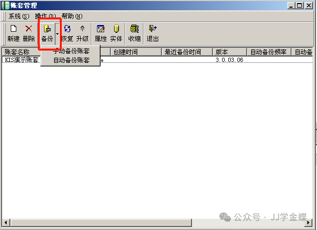 3)賬套列表中點中需要備份的賬套,點工具欄【備份】