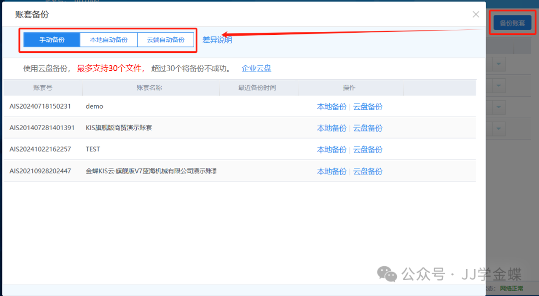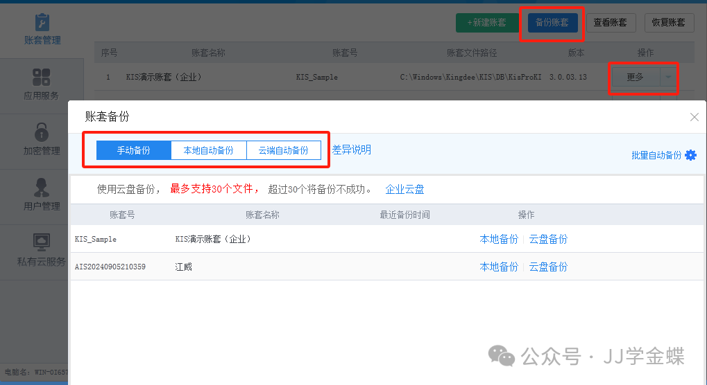 選擇備份賬套保存位置,建議勾上【備份到企業(yè)云盤】,點擊【備份】按鈕,這樣在本地路徑和金蝶企業(yè)云盤中同時進行備份。 2、金蝶KIS商貿(mào)版6.1及先前版本的賬套備份: 開始-所有程序-金蝶KIS商貿(mào)版-工具-賬套管理-備份-選備份路徑-確定; 3、商貿(mào)版7.0及以后版本的賬套備份: 服務(wù)器電腦右下角任務(wù)欄雙擊打開【金蝶KIS商貿(mào)版系統(tǒng)管理】-賬套后面-更多-手動備份-選定備份路徑-確定;