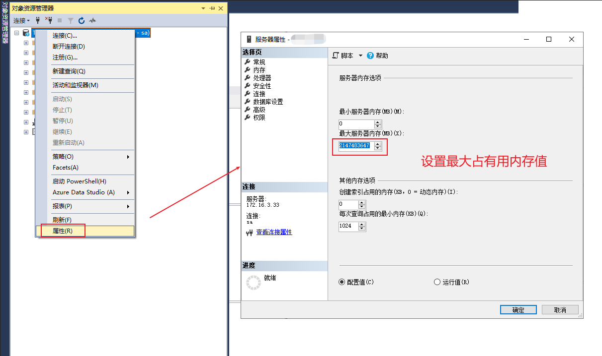 這些關(guān)鍵指標(biāo)提供了關(guān)于SQL Server內(nèi)存使用情況的全面視圖,并且對(duì)于診斷性能問(wèn)題非常有價(jià)值。通過(guò)定期監(jiān)控這些指標(biāo),可以及時(shí)發(fā)現(xiàn)潛在的問(wèn)題,并采取適當(dāng)?shù)拇胧﹣?lái)優(yōu)化SQL Server的性能。此外,結(jié)合動(dòng)態(tài)管理視圖(DMVs),如 緩存清除命令 以上命令雖然會(huì)清除掉現(xiàn)有緩存,為新的緩存騰出空間,但是Sql server并不會(huì)因此釋放掉已經(jīng)占用的內(nèi)存。Sql Server并沒(méi)有提供任何命令允許我們釋放不用到的內(nèi)存。因此我們只能通過(guò)動(dòng)態(tài)調(diào)整Sql Server可用的物理內(nèi)存設(shè) 置來(lái)強(qiáng)迫它釋放內(nèi)存。 如果想讓 Sql Server 主動(dòng)釋放 占用并空閑的內(nèi)存空間,可以設(shè)置Sql Server占用內(nèi)存的上限,就會(huì)讓Sql server在 內(nèi)存上限范圍內(nèi),主動(dòng)清除臟數(shù)據(jù)替換成熱數(shù)據(jù)。因此還得如下操作 三、設(shè)置內(nèi)存最大占用值設(shè)置方式: 從自帶的studio 連接,,在數(shù)據(jù)庫(kù)服務(wù)器名稱上點(diǎn)擊【右鍵】,選擇【屬性】,然后,找到【內(nèi)存】選項(xiàng),在右邊的【使用AWE分配內(nèi)存】(sqlServer64的應(yīng)該不用勾)左邊把對(duì)勾打上。在最大服務(wù)器內(nèi)存(MB)上填入適當(dāng)?shù)拇笮。ň唧w填多大,肯定不能超過(guò)計(jì)算機(jī)的物理內(nèi)存,建議控制在60%-75%),設(shè)置成功后重啟