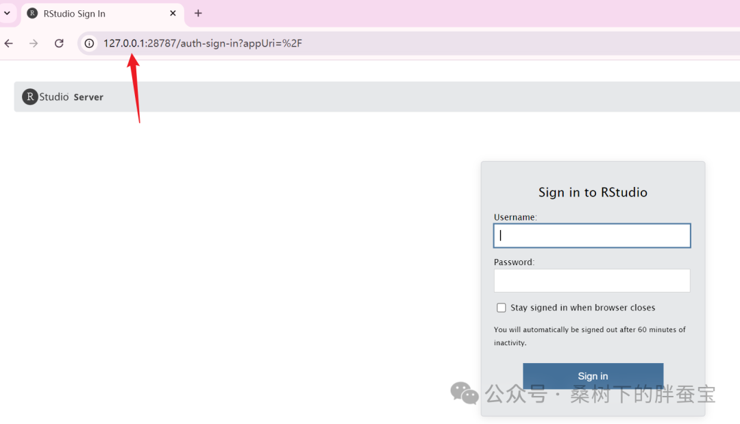隨后我們即可在本地訪問遠(yuǎn)程的Rstudio,瀏覽器輸入127.0.0.1:28787 (為什么是28787呢,其實這個無所謂的,關(guān)鍵是不要和你的本地電腦的端口沖突)。