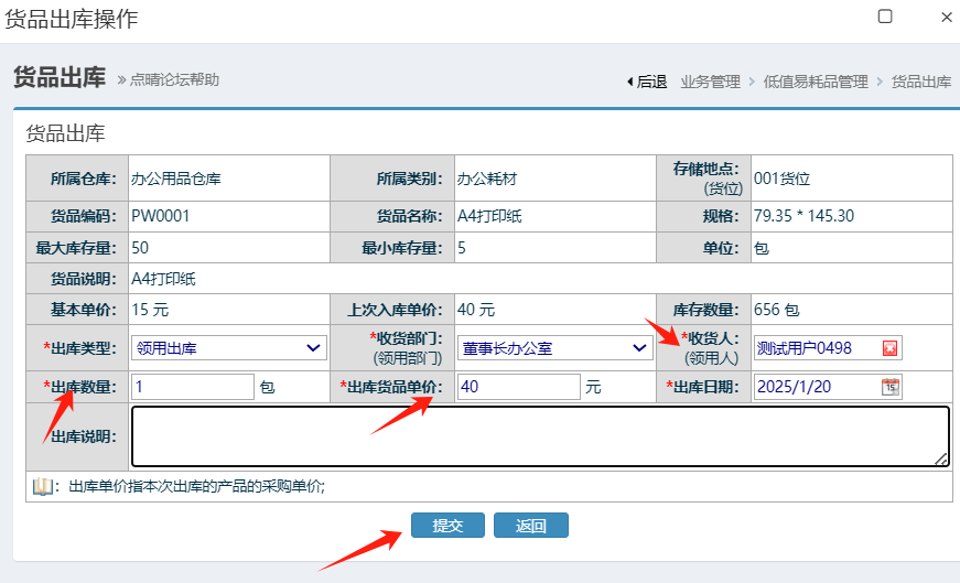 點(diǎn)晴永久免費(fèi)OA-低耗品管理-貨品庫存調(diào)整出庫操作