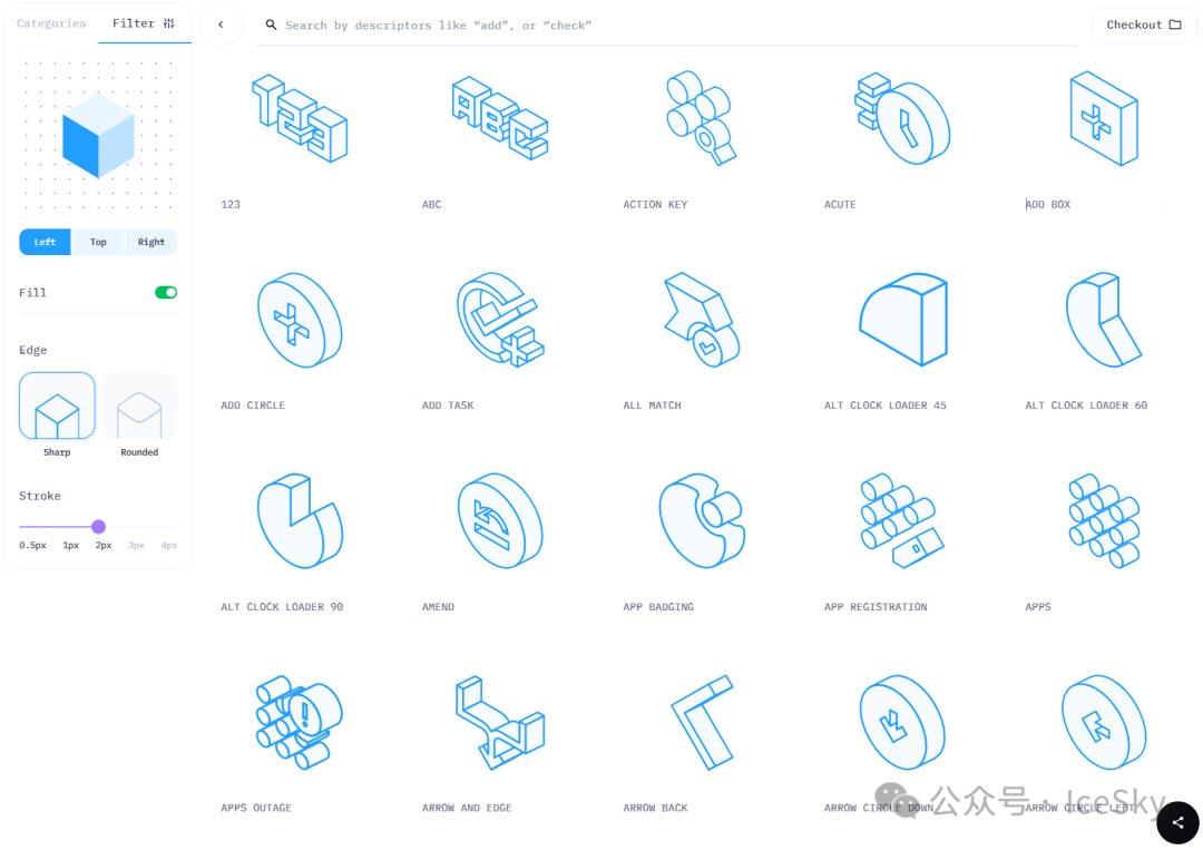此網(wǎng)站提供上萬(wàn)個(gè)等軸測(cè)圖標(biāo),可以切換左、上、右角度;指定直角或圓角邊緣;指定是否填充;指定線寬、尺寸、顏色;可以復(fù)制SVG代碼及下載SVG及Png圖片文件。