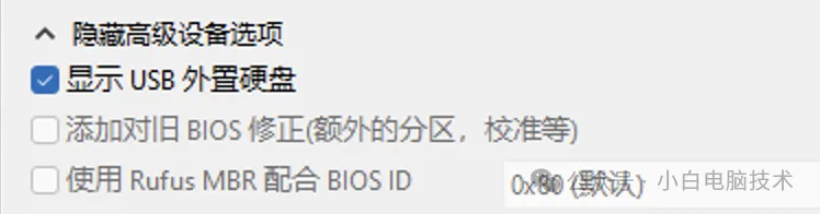 如果這時候你接入的是移動硬盤,那就需要把【高級設備選項】的【顯示USB外置硬盤】勾選上。