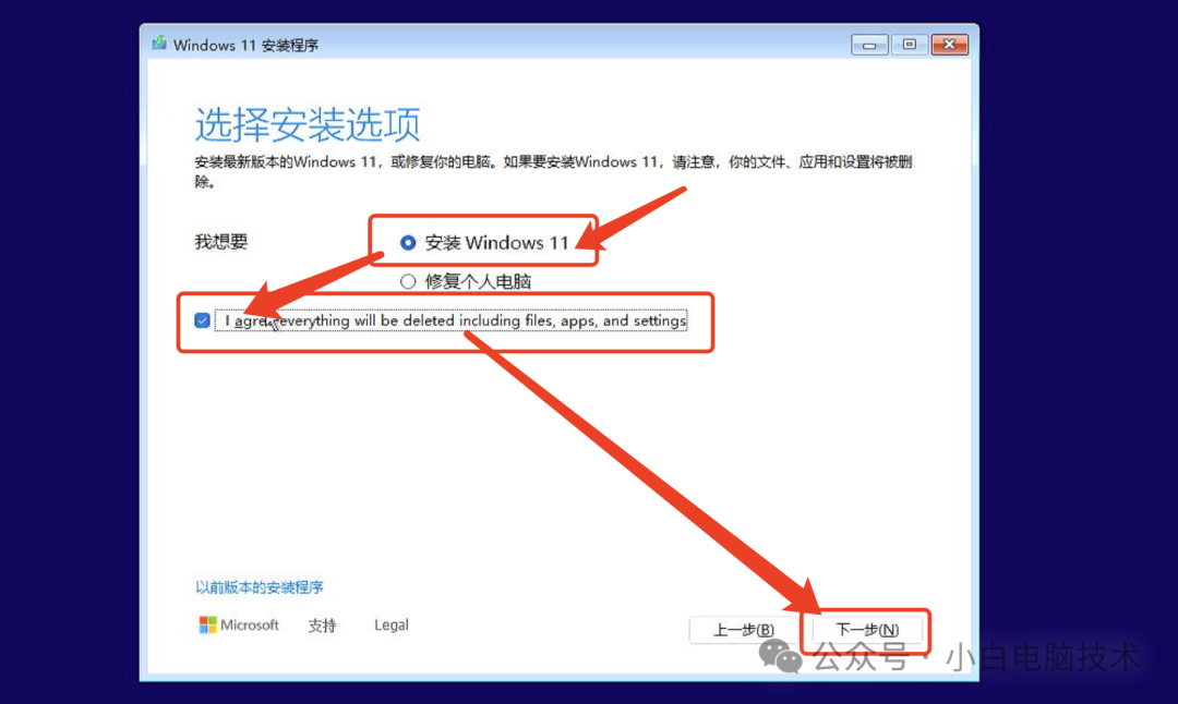 直到這個界面,選擇【安裝Windows 11】,勾選【I argee ****】,然后點擊【下一步】