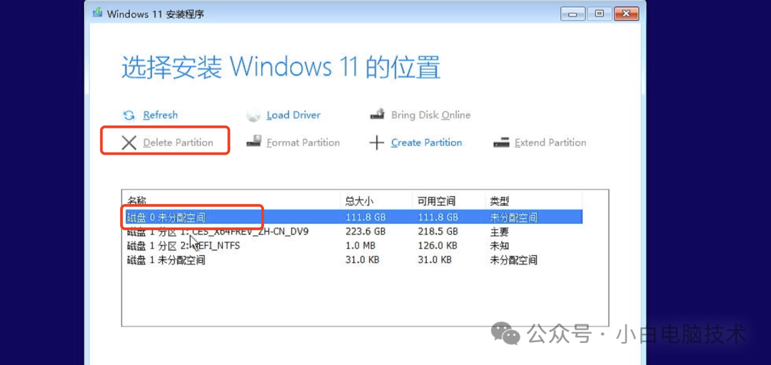 2)確定安裝在驅動器0之后,把所有標記有驅動器0的分區(qū)全部刪除(如果磁盤0的其他分區(qū)有重要文件,請勿這樣操作哦!可以直接選擇磁盤0里的系統(tǒng)安裝分區(qū)直接下一步安裝就行) 刪除完之后頁面就會是這樣