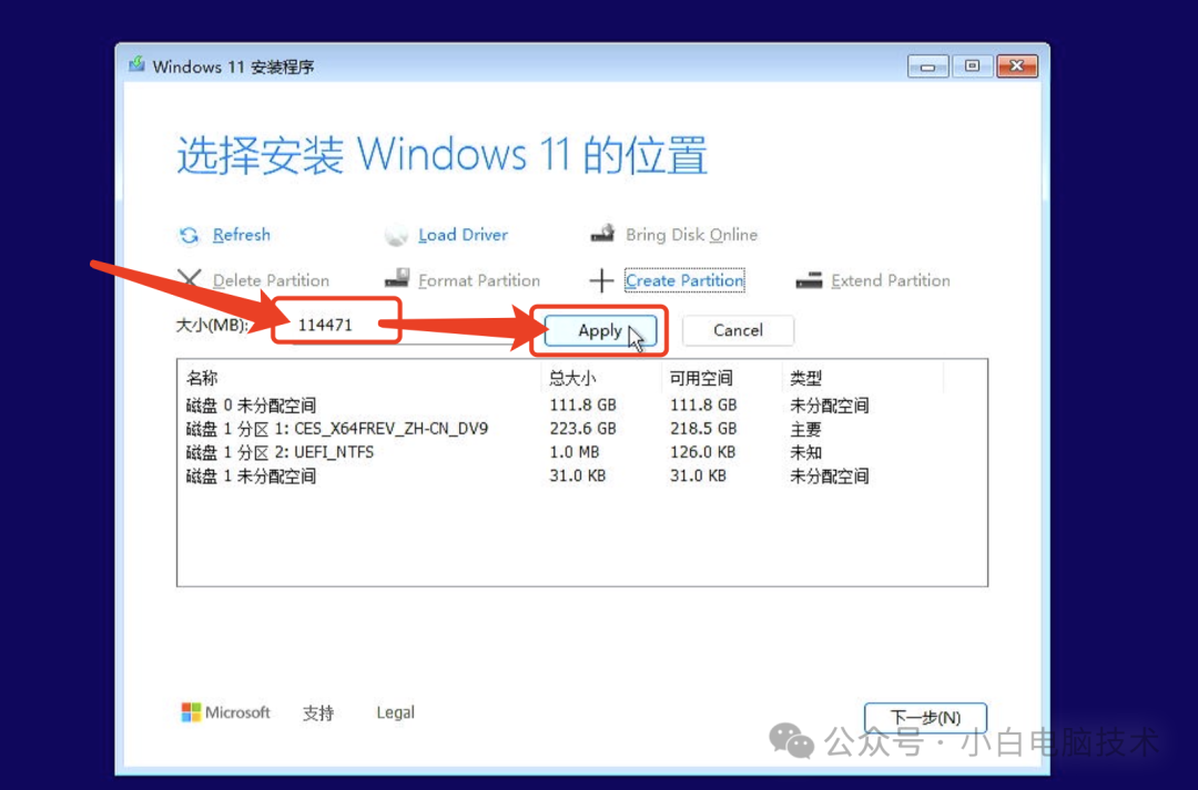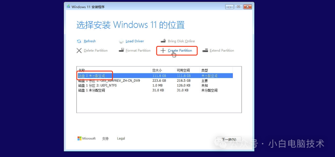 5)接下來就按照容量區(qū)分剛剛劃出來準備做C盤的分區(qū),然后點擊【下一步】