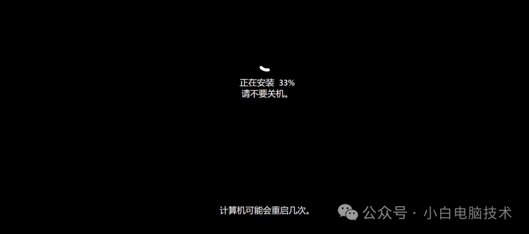 5、這個界面會重啟兩次(等待時間是需要看你的硬盤和U盤傳輸速度的,我這里全是固態(tài)硬盤,所以安裝過程大概5分鐘), 重要??:(記得記得把網(wǎng)線或WIFI拔掉)