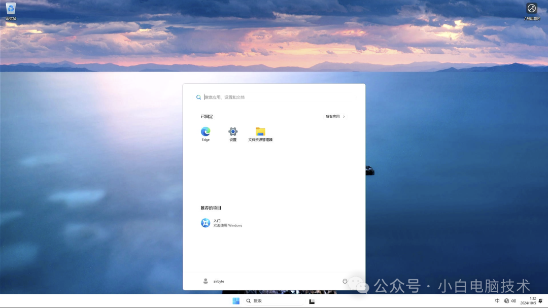 本次更新版本號為Windows 11 24H2,操作系統(tǒng)版本為26100.1742(發(fā)布日期:2024年10月1日) 我們先來看看界面: 首先映入眼簾的是Windows11已經(jīng)安裝完成剛進入桌面的界面,真的干凈整潔(沒有多余的圖標)