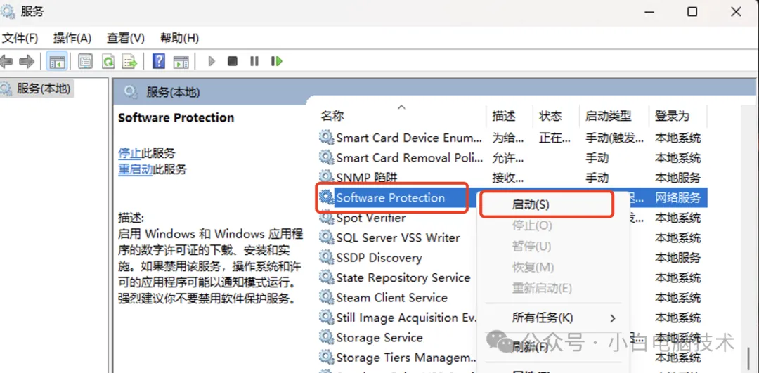 找到【Software Protection】,點(diǎn)擊【鼠標(biāo)右鍵】-【啟動(dòng)】即可。