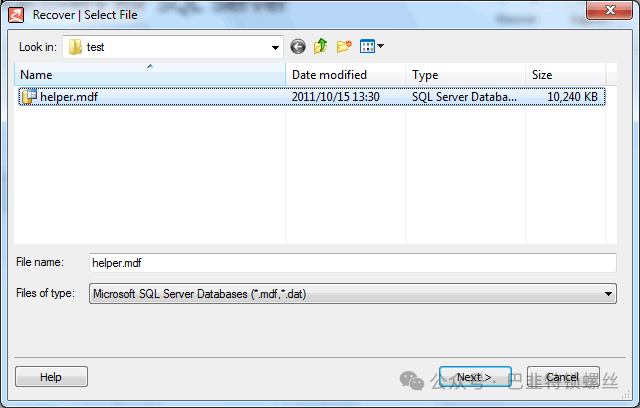 2. 點擊菜單中的 File > Recover,選擇要恢復(fù)的數(shù)據(jù)庫的數(shù)據(jù)文件(.mdf)