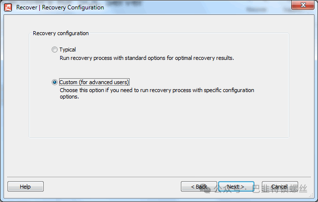3. Next > Next,進入 Recovery Configuration 界面,選擇Custom(選擇了Custom才可以選擇從日志中恢復(fù)誤刪除的數(shù)據(jù))。
