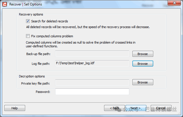 4. Next 進入 Recovery options 窗口,選中 Search for deleted records,并選擇要恢復(fù)的數(shù)據(jù)庫的日志文件路徑(log file path)。