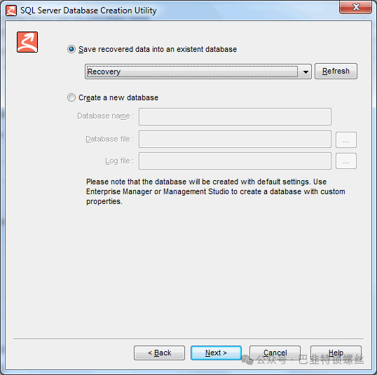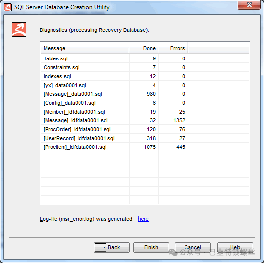 6. 點擊Start,開始恢復(fù)操作(在上一步選擇的目標文件夾中生成相應(yīng)的SQL文件與Bat文件),然后,出現(xiàn) SQL Server Database Creation Utility 窗口。