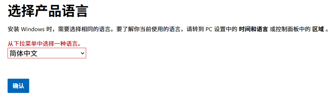 4、選擇產(chǎn)品語(yǔ)言為“簡(jiǎn)體中文”,點(diǎn)擊“確認(rèn)”;