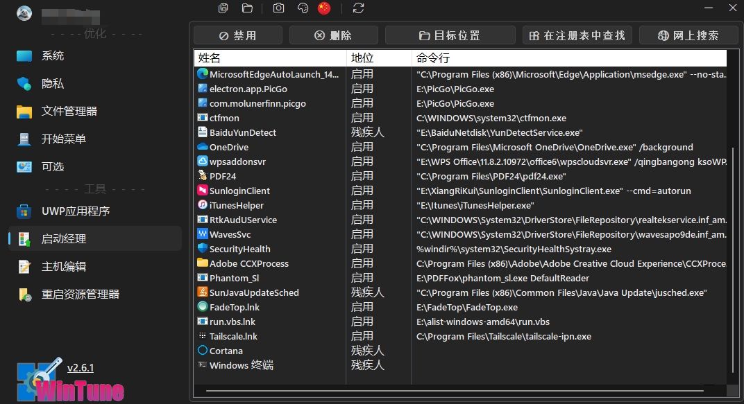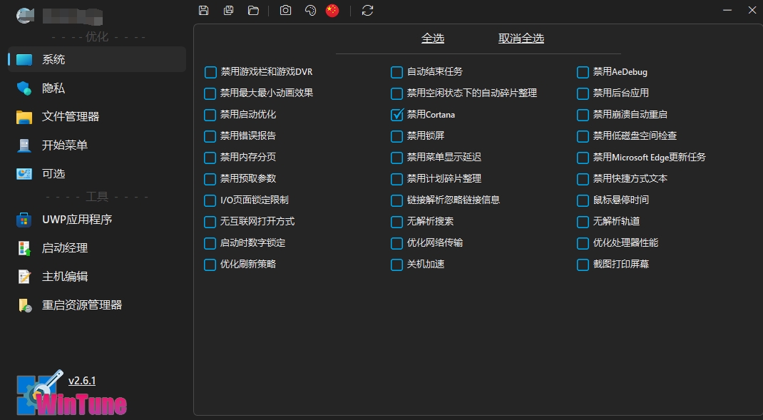 WinTune-v2.6.1 是一款免費、簡潔、開源的window系統(tǒng)優(yōu)化工具,可對一些層級較深的系統(tǒng)選項進行修改