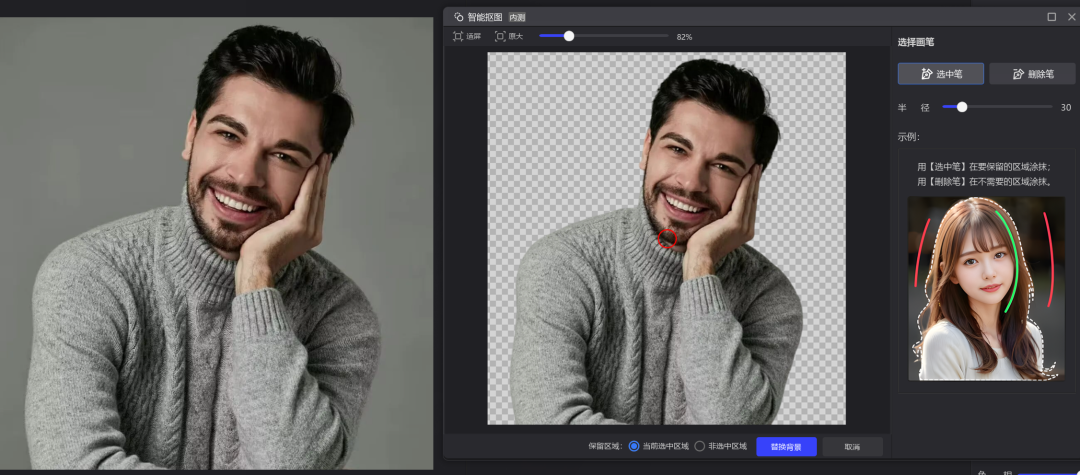 然后來試試智能摳圖,效果很不錯,發(fā)絲也摳得很干凈。