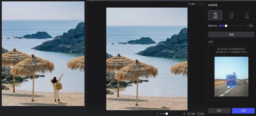 再來一張風景照片,測試AI消除,可以直接去除圖片中不需要的物體。