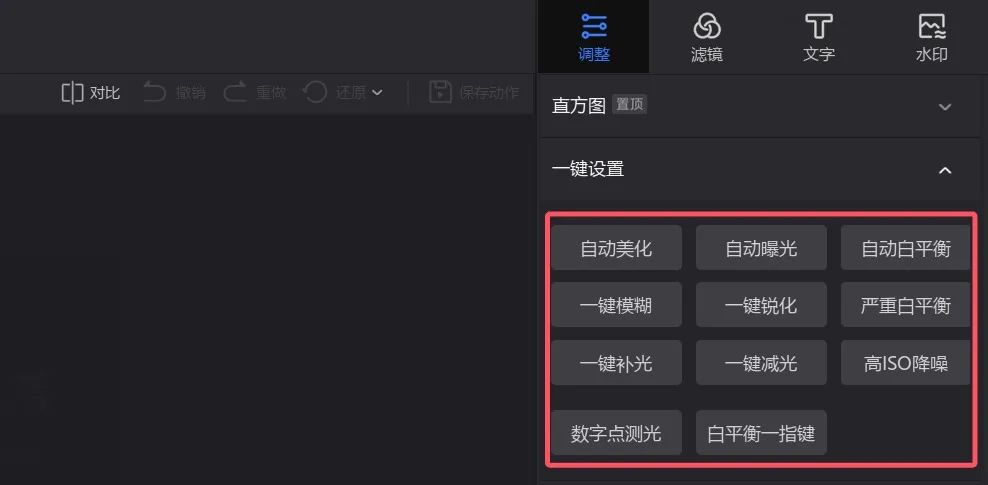 同時它還保留了常規(guī)的功能,如自動美化,自動曝光,自動白平衡,一鍵模糊,一鍵銳化,一鍵補光和減光等。