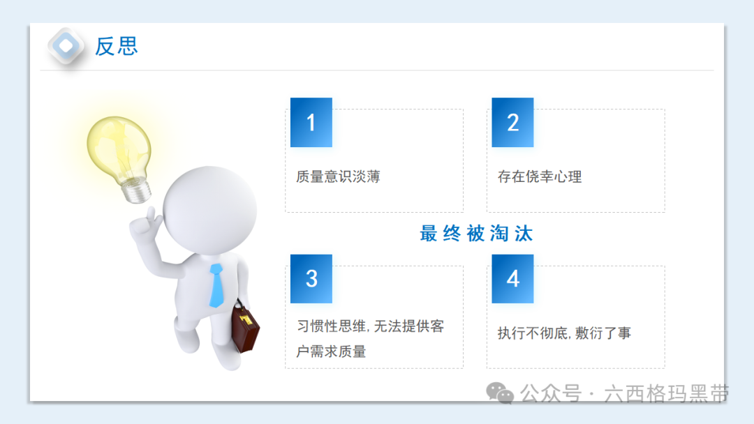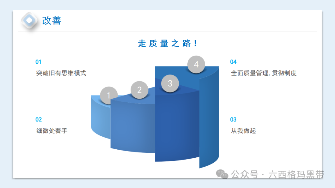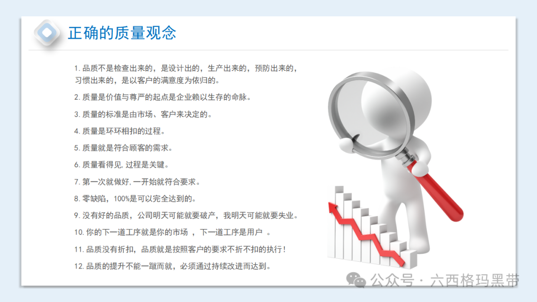 持續(xù)改進(jìn)與質(zhì)量意識(shí)提升質(zhì)量意識(shí)的提升是一個(gè)持續(xù)的過(guò)程,我們需要不斷改善,持續(xù)改進(jìn)。不是不愿改進(jìn),而是不屑于小的改進(jìn)。原來(lái)的老思想根深蒂固,一時(shí)難以適應(yīng),但我們必須努力克服,以適應(yīng)新的質(zhì)量要求。質(zhì)量的提升需要治標(biāo)更要治本,首先主管要有更強(qiáng)的質(zhì)量意識(shí),然后主管再加強(qiáng)操作工的培訓(xùn)。治本的關(guān)鍵在于提升全員質(zhì)量意識(shí),包括意識(shí)和專(zhuān)業(yè)知識(shí)的培訓(xùn)、規(guī)范的操作培訓(xùn)以及培訓(xùn)的考核。 持續(xù)改進(jìn)的重要性持續(xù)改進(jìn)是質(zhì)量提升的關(guān)鍵。我們不能滿(mǎn)足于現(xiàn)狀,而要不斷尋找改進(jìn)的機(jī)會(huì)。例如,通過(guò)定期的質(zhì)量審核,發(fā)現(xiàn)生產(chǎn)過(guò)程中的問(wèn)題,并采取措施進(jìn)行改進(jìn);通過(guò)員工的建議和反饋,不斷優(yōu)化生產(chǎn)流程和產(chǎn)品質(zhì)量。持續(xù)改進(jìn)需要我們?nèi)珕T參與,每一個(gè)人都要樹(shù)立質(zhì)量意識(shí),積極提出改進(jìn)建議。 提升全員質(zhì)量意識(shí)