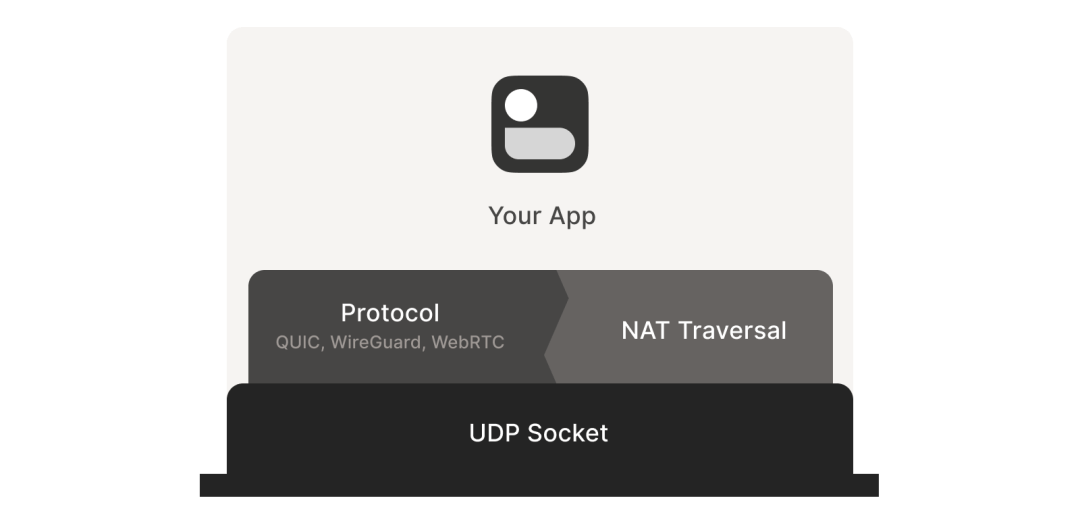 某些協(xié)議(例如 ?WebRTC)將 NAT 穿透與其他部分緊密集成。但如果你在構(gòu)建自己的協(xié)議,? 建議將 NAT 穿透作為一個獨(dú)立實體,與主協(xié)議并行運(yùn)行 ,二者僅 僅是共享 socket 的關(guān)系,如下圖所示,這將帶來很大幫助: