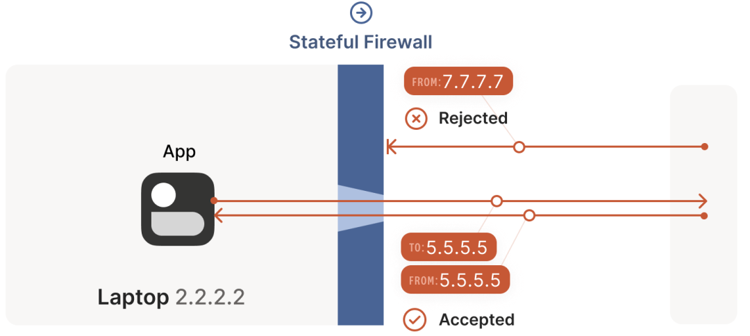 筆記本電腦中自帶了一個防火墻,當(dāng)該防火墻看到從這臺機(jī)器出去的? 2.2.2.2:1234 -> 5.5.5.5:5678?包時,就會記錄一下: 5.5.5.5:5678 -> 2.2.2.2:1234?入向包應(yīng)該放行。 這里的邏輯 是:我們信任的世界(即筆記本)想主動與? 5.5.5.5:5678?通信,因此應(yīng)該放行(allow)其回包路徑。