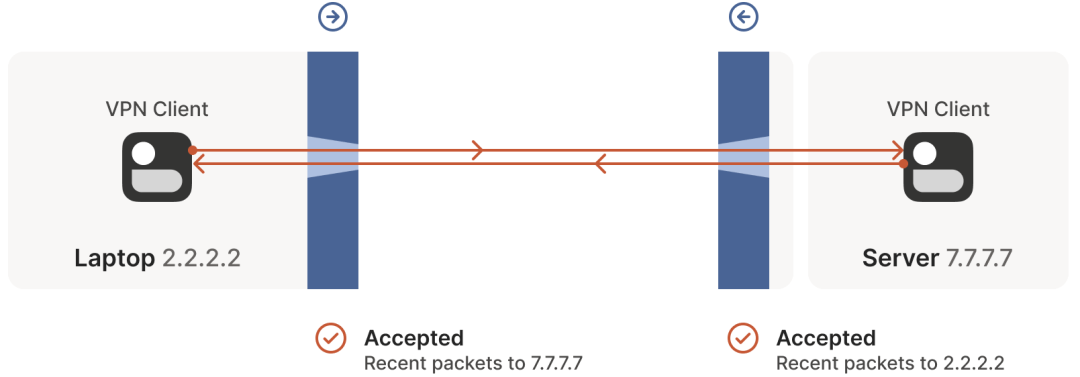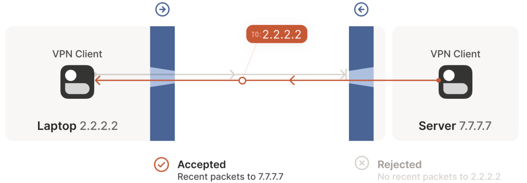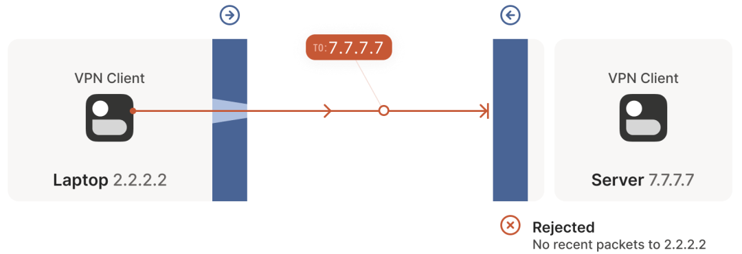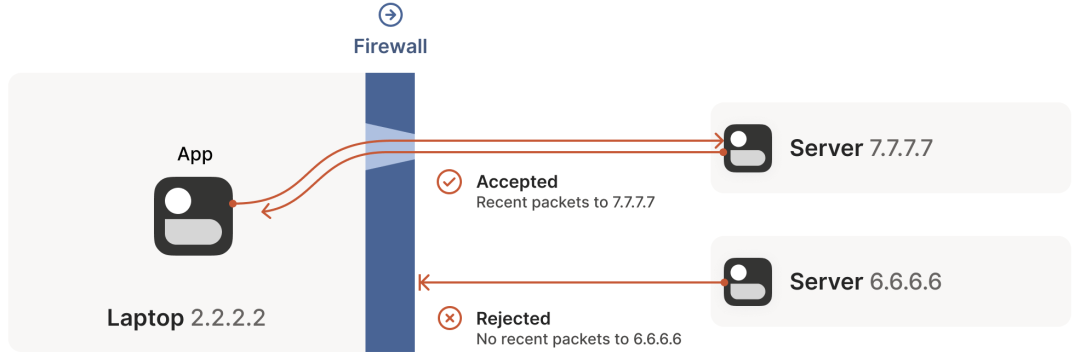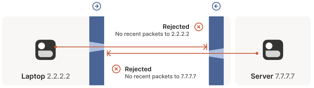 對方的防火墻會將這個包攔截掉,因為它沒有? 7.7.7.7:5678 -> 2.2.2.2:1234 ?的流量記錄。但另一方面,Windows Defender 此時已經(jīng)記錄了出向連接,因此會允許? 7.7.7.7:5678 -> 2.2.2.2:1234 ?的應(yīng)答包進(jìn)來。