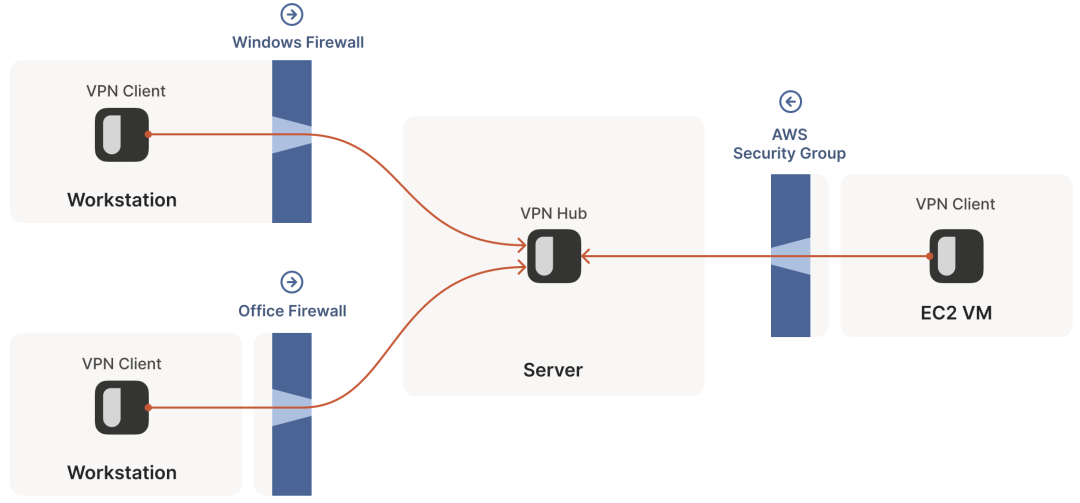但上圖是 假設(shè)了 通信雙方中,其中一端**(服務(wù)端)是能直接訪問到的**。在 VPN 場景中,這就形成了所謂的? hub-and-spoke 拓?fù)?/strong>:中心的 hub 沒有任何防火墻策略,誰都能訪問到;防火墻后面的 spokes 連接到 hub。如下圖所示: