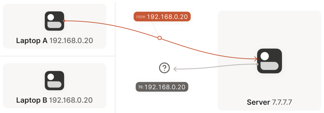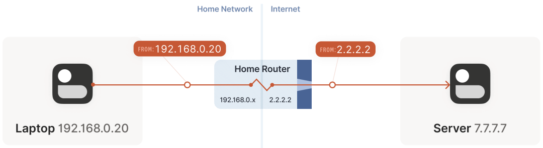 在它 自己的公網(wǎng) IP 上挑一個可用的 UDP 端口 ,例如? 2.2.2.2:4242 , 然后創(chuàng)建一個? NAT mapping : 192.168.0.20:1234 ? <--> ? 2.2.2.2:4242 , 然后將包發(fā)到公網(wǎng),此時源地址變成了? 2.2.2.2:4242 ?而不是原來的? 192.168.0.20:1234 。因此服務(wù)端看到的是轉(zhuǎn)換之后地址, 接下來,每個能匹配到這條映射規(guī)則的包,都會被路由器改寫 IP 和 端口。 反向路徑是類似的,路由器會執(zhí)行相反的地址轉(zhuǎn)換,將? 2.2.2.2:4242 ?變回 ? 192.168.0.20:1234 。對于筆記本來說,它根本感知不知道這正反兩次變換過程。