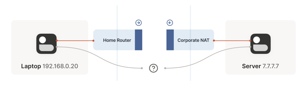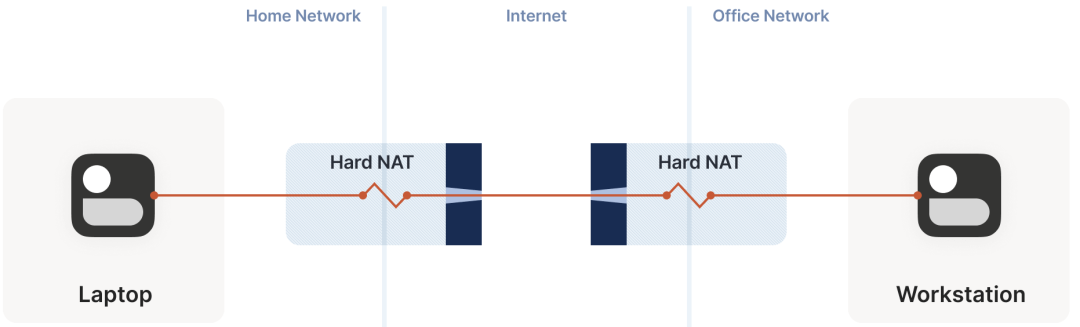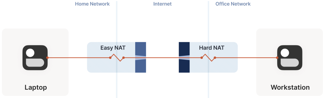 這顯然對用戶不友好,在像 Tailscale 這樣的 mesh 網(wǎng)絡(luò)中的擴(kuò)展性也不好,在 mesh 網(wǎng)絡(luò)中,我們假設(shè)對端會以一定的粒度在公網(wǎng)上移動。 此外,在很多情況下用戶也沒有防火墻的控制權(quán)限:例如在咖啡館或機(jī)場中,連接的路 由器是不受你控制的(否則你可能就有麻煩了)。 因此,我們需要尋找一種不用重新配置防火墻的方式。