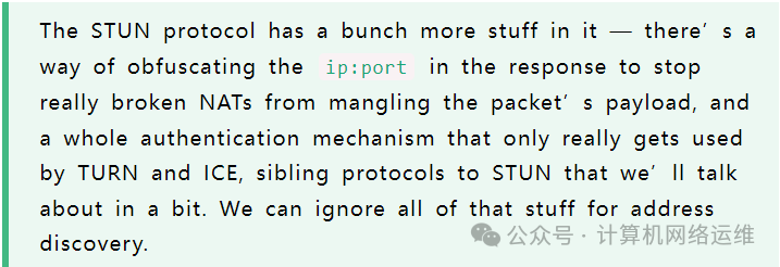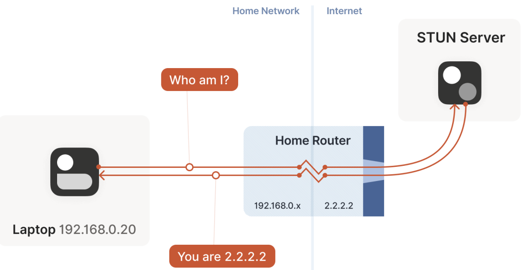 筆記本向 STUN 服務(wù)器發(fā)送一個請求:“從你的角度看,我的地址什么?” STUN 服務(wù)器返回一個響應(yīng):“我看到你的 UDP 包是從這個地址來的: ip:port ”。
