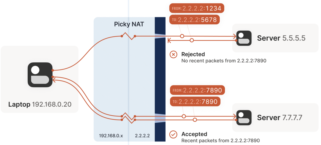 但其實這些術(shù)語 相當(dāng)讓人困惑 。我每次都要 查一下 Restricted Cone NAT 是什么意思。從實際經(jīng)驗來看,我并不是唯一對此感到困惑的人。例如,如今互聯(lián)網(wǎng)上將 “easy” NAT 歸類為 Full Cone,而實際上它們更應(yīng)該歸類為 Port-Restricted Cone。