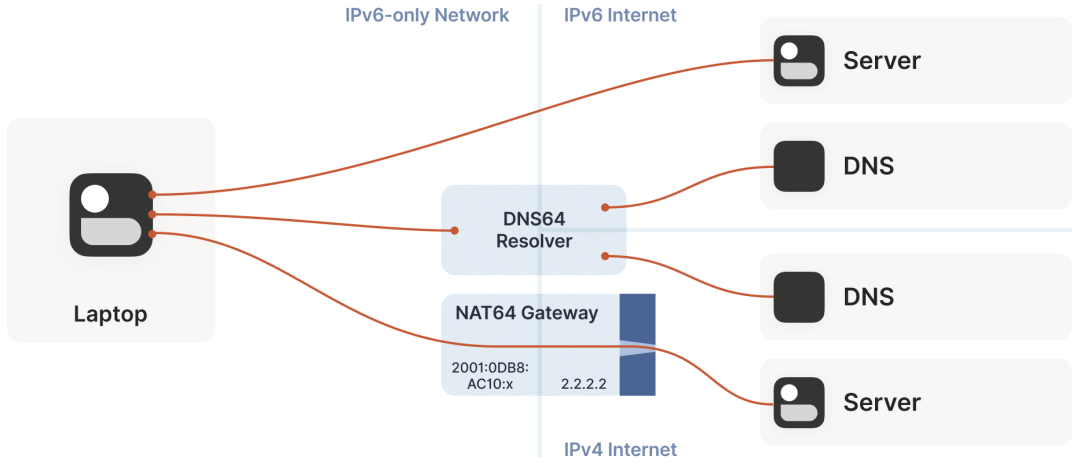 如果需要處理 DNS 問題,那這種方式工作良好。例如,如果連接到 google.com,將這個域名解析成 IP 地址的過程會涉及到 DNS64 設(shè)備,它又會進(jìn)一步 involve NAT64 設(shè)備,但后一步對用戶來說是無感知的。