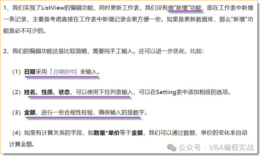 1、UserForm1,我們調(diào)整了用戶窗體的布局,增加了一個(gè)“新增”按鈕,本來還增加了一個(gè)“保存”按鈕,用于新增項(xiàng)目的保存,后來發(fā)現(xiàn)也沒有必要,我們編輯新增項(xiàng)目的各列數(shù)據(jù),則會(huì)自動(dòng)保存。 2、UserForm2,用來實(shí)現(xiàn)下拉列表輸入,上面有一個(gè)復(fù)合框,一個(gè)確定命令按鈕: 3、日期控件的用戶窗體復(fù)制過來。 1、增加一張工作表“姓名”,用來存放姓名列表: 2、工作表Settings修改了一下,增加了兩個(gè)項(xiàng)目,用于下拉列表輸入: 1、我們?cè)谟脩舸绑w啟動(dòng)時(shí),把姓名、性質(zhì)、狀態(tài)分別裝入對(duì)應(yīng)的字典。 2、當(dāng)我們點(diǎn)擊ListView,顯示InkEdit控件,這時(shí),我們雙擊InkEdit控件,根據(jù)所在列的不同,分別顯示日期控件、UserForm2用戶窗體,在UserForm2中,combobox的List隨之變化。 3、當(dāng)我們?cè)贗nkEdit中輸入內(nèi)容,不管是日期控件錄入、還是下拉列表錄入,還是手工錄入,我們都會(huì)檢查錄入數(shù)據(jù)的有效性,日期列應(yīng)為日期格式,金額列應(yīng)為數(shù)字,姓名、性質(zhì)、狀態(tài)應(yīng)包括在指定的列表中。 完整代碼文本,詳見另一條推文。 1、如果數(shù)據(jù)量大,全部加載到ListView會(huì)很慢,解決方法有幾種: (1)逐步加載,窗體啟動(dòng)時(shí),只加載前面幾條數(shù)據(jù),當(dāng)向下拖動(dòng)滾動(dòng)條時(shí),再加載一部分,可以實(shí)現(xiàn),但我覺得意義不大(主要還是比較麻煩)。 (2)根據(jù)篩選條件,加載滿足一個(gè)條件的數(shù)據(jù),比如月份,我們可以加載最近一個(gè)月份的數(shù)據(jù),如果要查看其他月份,我們?cè)趶?fù)合框中選擇即可。這個(gè)方法我比較喜歡,也是經(jīng)常用的。 (3)通過禁止屏幕刷新之類的方法,加快運(yùn)行速度。這種方法有時(shí)候有效,但在今天這個(gè)案例中基本沒什么效果。 (4)把原始數(shù)據(jù)存到數(shù)據(jù)庫(kù)里,因?yàn)椋绻麛?shù)據(jù)量大,整個(gè)EXCEL的運(yùn)行速度都會(huì)受到影響。 2、這兩天有點(diǎn)忙,一方面年底了,事情比較多;另一方面,接了一個(gè)小活,是關(guān)于行政事業(yè)單位年終決算報(bào)表批量導(dǎo)入的,根據(jù)從系統(tǒng)中導(dǎo)出來的“可執(zhí)行指標(biāo)執(zhí)行情況表”數(shù)據(jù),以及“2024決算統(tǒng)計(jì)表 (導(dǎo)入模板)”,生成可導(dǎo)入的報(bào)表數(shù)據(jù),一次性導(dǎo)入報(bào)表系統(tǒng),可以極大地減輕行政事業(yè)單位財(cái)務(wù)人員編制決算統(tǒng)計(jì)表的壓力。 據(jù)說這套報(bào)表是全國(guó)統(tǒng)一的,如果有這方面需求的朋友可以聯(lián)系定制。 3、關(guān)于WPS報(bào)錯(cuò)的問題,我們?cè)凇?/span>WPS支持64位的VBA代碼啦?」一文中更正了BUG,但仍然是只適用64位的,這次增加了支持32位的代碼,主要是API函數(shù)與變量聲明方面,但我沒有32位的環(huán)境,沒法測(cè)試,也不知能不能正常運(yùn)行。 4、還有其他一些細(xì)節(jié)方面的更新,就不一一說明了。 閱讀原文:原文鏈接 該文章在 2025/2/5 17:02:58 編輯過 |
