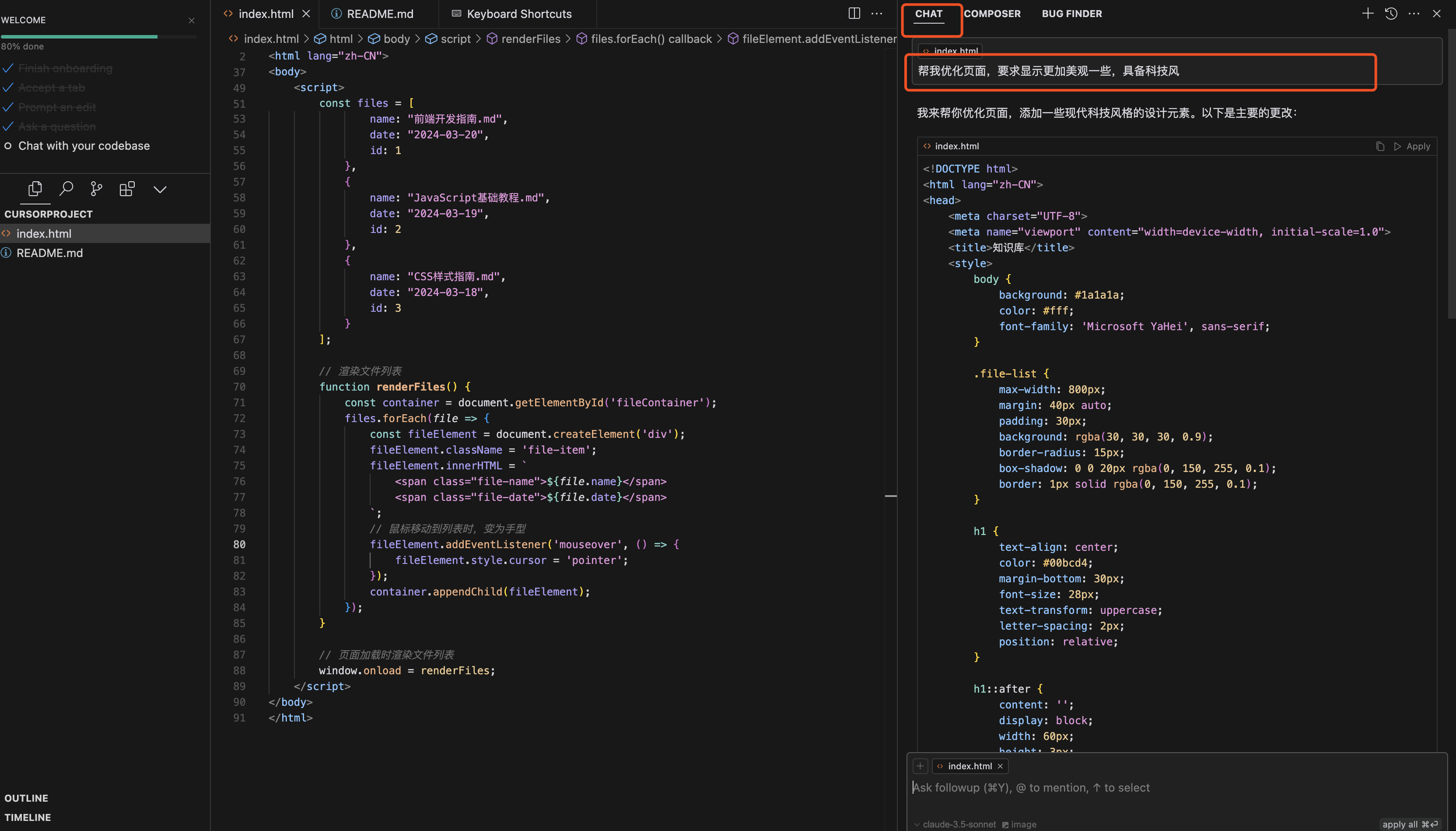 3.基本功能使用3.1創(chuàng)建代碼結(jié)構(gòu)Mac用戶使用Command + i 可以喚醒Composer,然后我們輸入提示詞創(chuàng)建代碼結(jié)構(gòu)