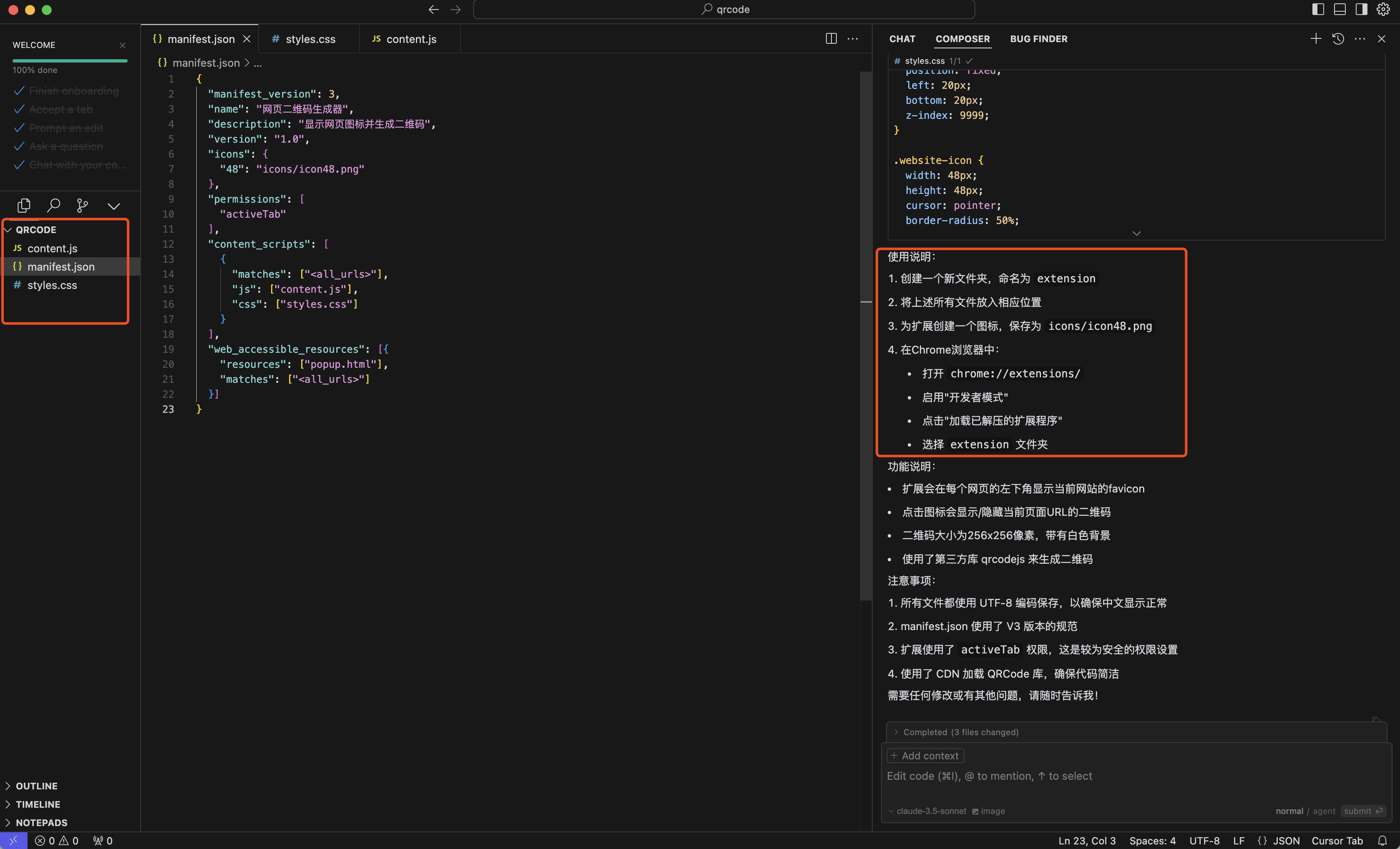 4. 開發(fā)谷歌瀏覽器插件在AI工具出現(xiàn)之前,我們開發(fā)谷歌瀏覽器插件需要學(xué)習(xí)JS、HTML的前端知識,還需要了解谷歌插件開發(fā)規(guī)范,才能開發(fā)出一個能用的插件。 現(xiàn)在有了Cursor這類AI編程工具,只需要簡簡單單的提需求就能完成插件的制作和開發(fā)了。 下面是實際開發(fā)示例,在網(wǎng)頁上生成一個二維碼,掃碼可以跳轉(zhuǎn)到當(dāng)前頁面的一個插件。 開始之前可以先新創(chuàng)建個文件夾,用于存生成的多個前端代碼文件。 提示詞如下: