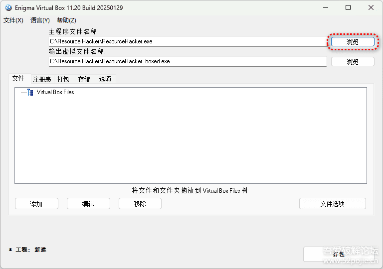 1. 點擊“主程序文件名稱”后面的“瀏覽”,一步步選擇到要制作成單文件版的綠色程序文件夾,如 C:\Resource Hacker\文件目錄下的ResourceHacker.exe文件